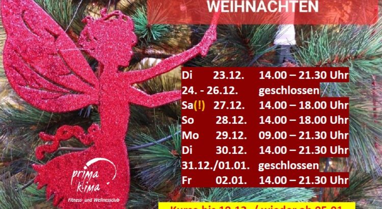 15.12.2025 Weihnachts-Öffnungszeiten Hier vorab schonmal die Zeiten für Training, Spiel und Entspannung rund um die Weihnachtsfeiertage.